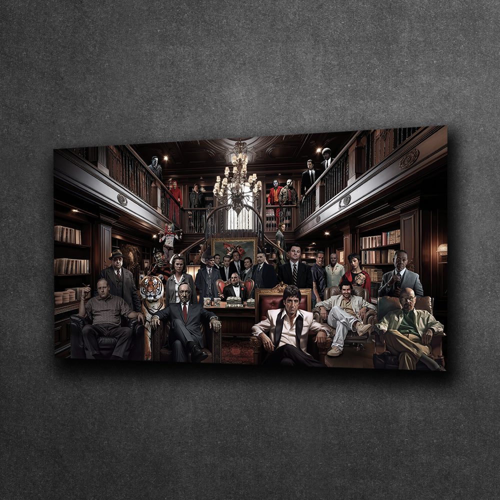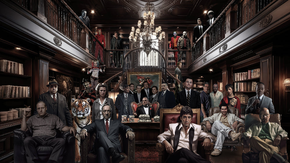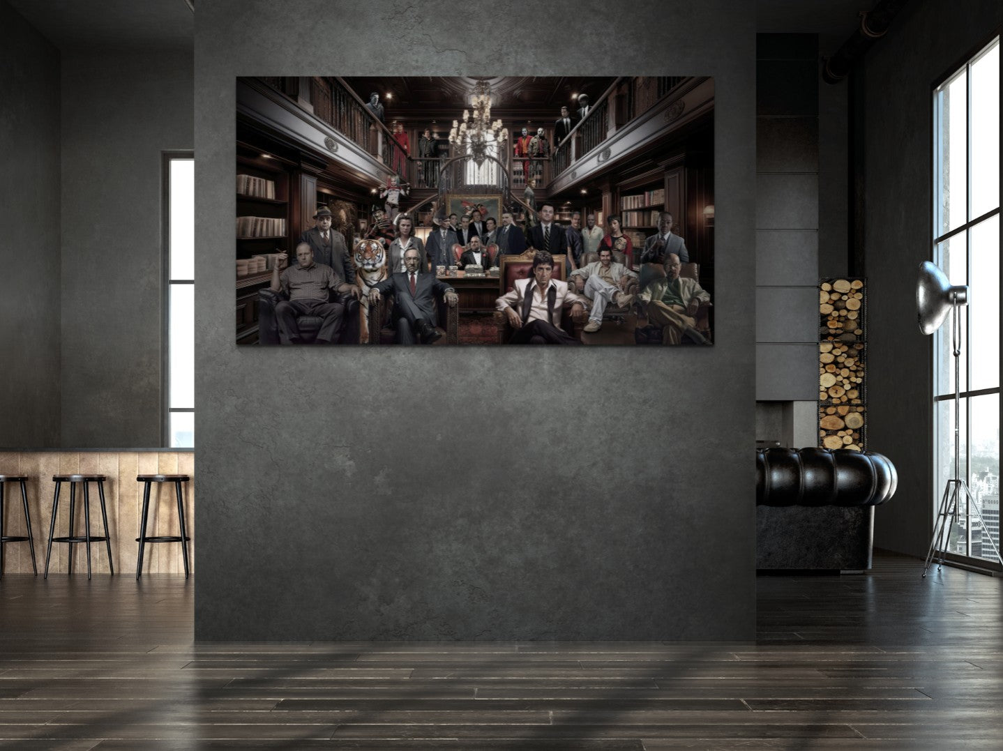 Dit kunstwerk brengt de meest iconische gangsters uit films en tv samen in een chique setting. Van Tony Montana tot Vito Corleone, het laat zien hoe krachtig en invloedrijk deze figuren zijn. Het contrast tussen de ruige maffiafiguren en de luxe omgeving zorgt voor een bijzonder effect en laat de impact van de onderwereld zien.