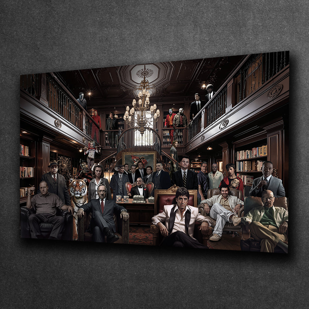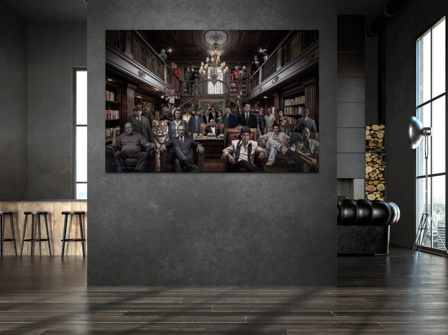 Dit kunstwerk brengt de meest iconische gangsters uit films en tv samen in een chique setting. Van Tony Montana tot Vito Corleone, het laat zien hoe krachtig en invloedrijk deze figuren zijn. Het contrast tussen de ruige maffiafiguren en de luxe omgeving zorgt voor een bijzonder effect en laat de impact van de onderwereld zien.